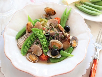 入れて両面を軽く焼き、あさり、スナップエンドウ、ミニトマト、酒を入れ、蓋をして蒸