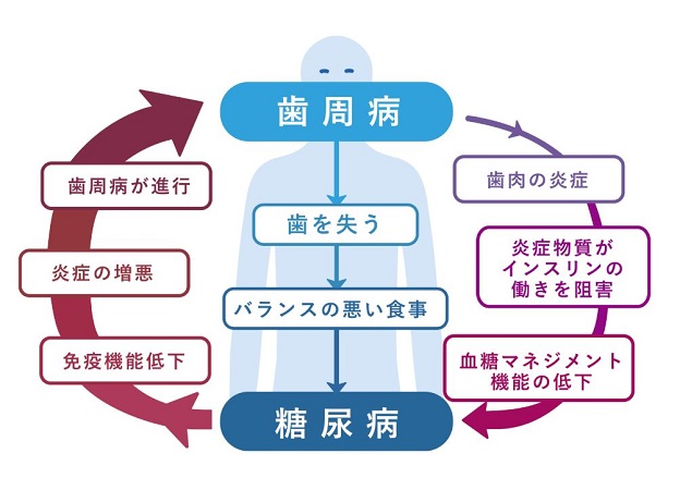 さらに、歯周病は血糖値のコントロールを難しくして糖尿病を悪化させる原因になります。