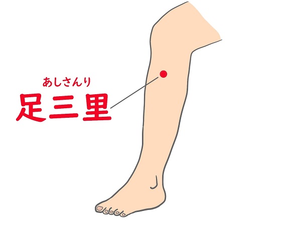 【位 置】足三里…ひざのお皿の下から、指幅4本分下で、すねの骨の外側にあります。